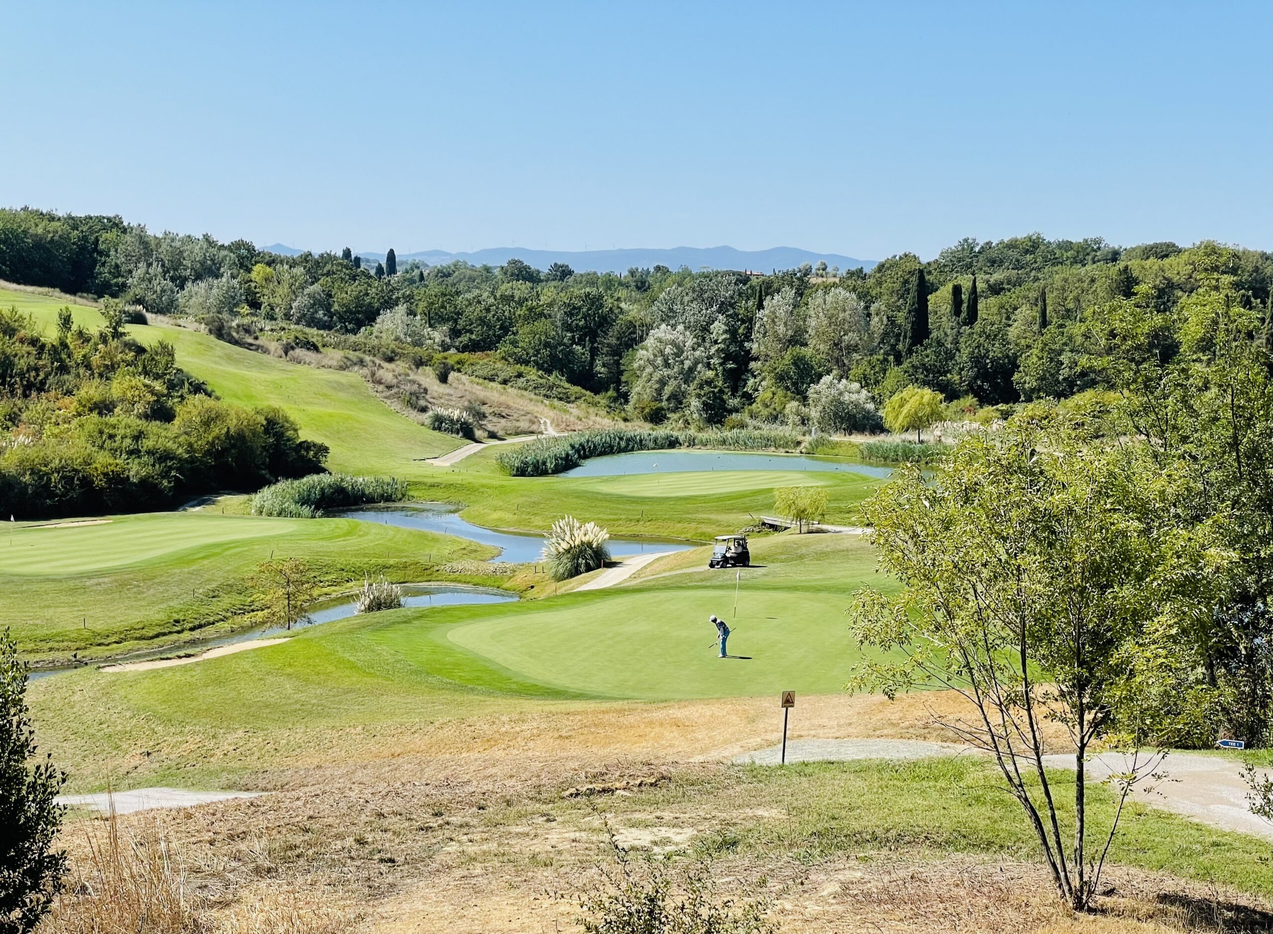Campo da golf 27 buche, uno dei percorsi più affascinanti dal punto di vista paesaggistico e più stimolanti dal punto di vista sportivo. Una sfida per i giocatori esperti che mette a disposizione anche un campo pratica con battitori in erba, postazioni coperte per lo svolgimento di clinics e la Club House con il bar/ristorante e la terrazza con una splendida vista sotto le querce secolari